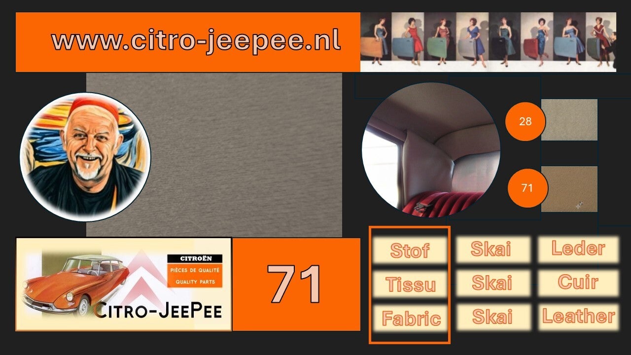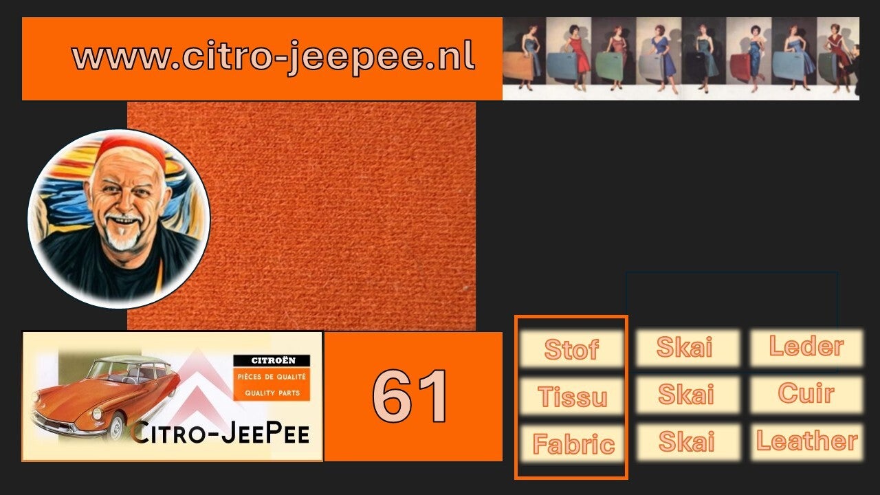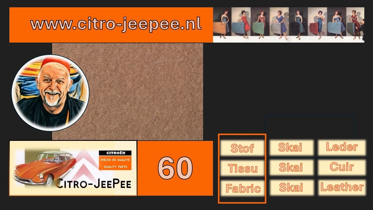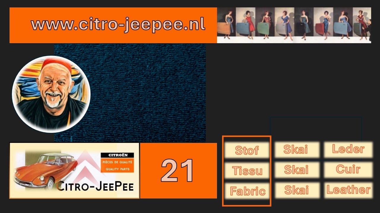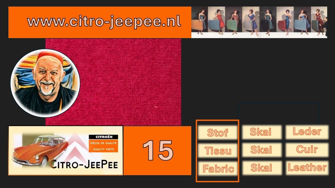 Hieronder ziet u een overzicht van de beschikbare kleurvoorbeelden van stof (1955 tot en met 1962) die Citro-JeePee kan leveren voor zowel het interieur als exterieur van uw Citroën DS of Citroën ID.