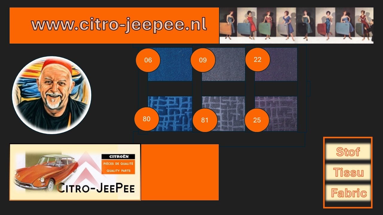 Hieronder ziet u een overzicht van de beschikbare kleurvoorbeelden van stof (1963 tot en met 1968) die Citro-JeePee kan leveren voor zowel het interieur als exterieur van uw Citroën DS of Citroën ID.